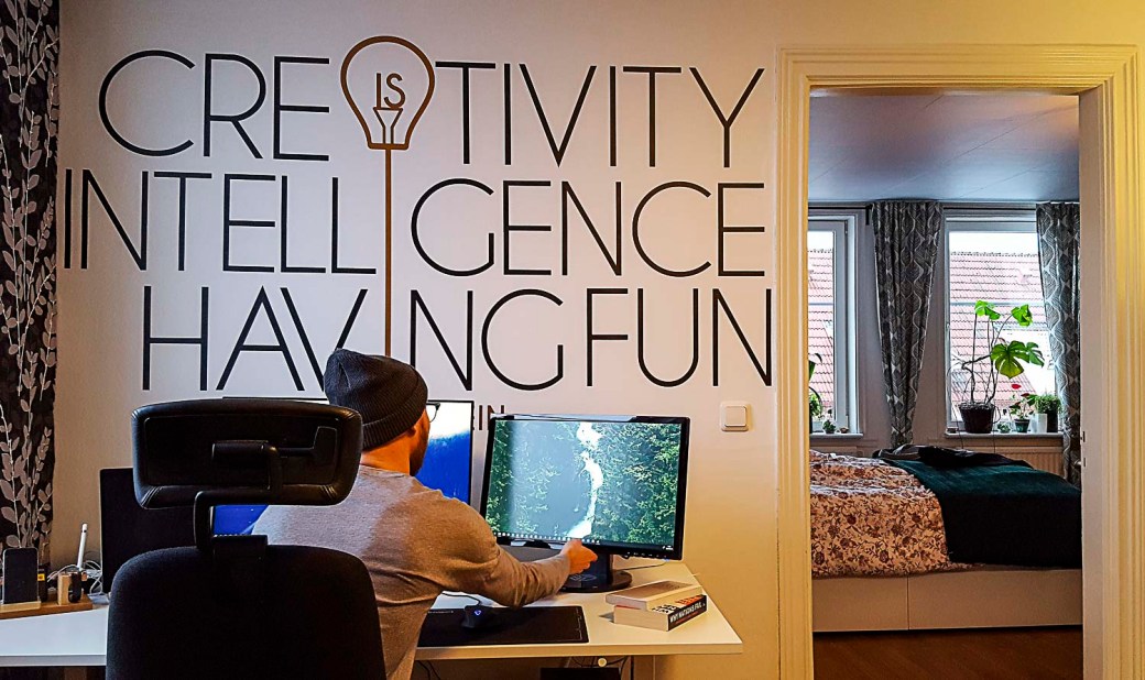 Snapshot of my son’s desk – (he is a graphic designer, and the wall quote is by Einstein)
