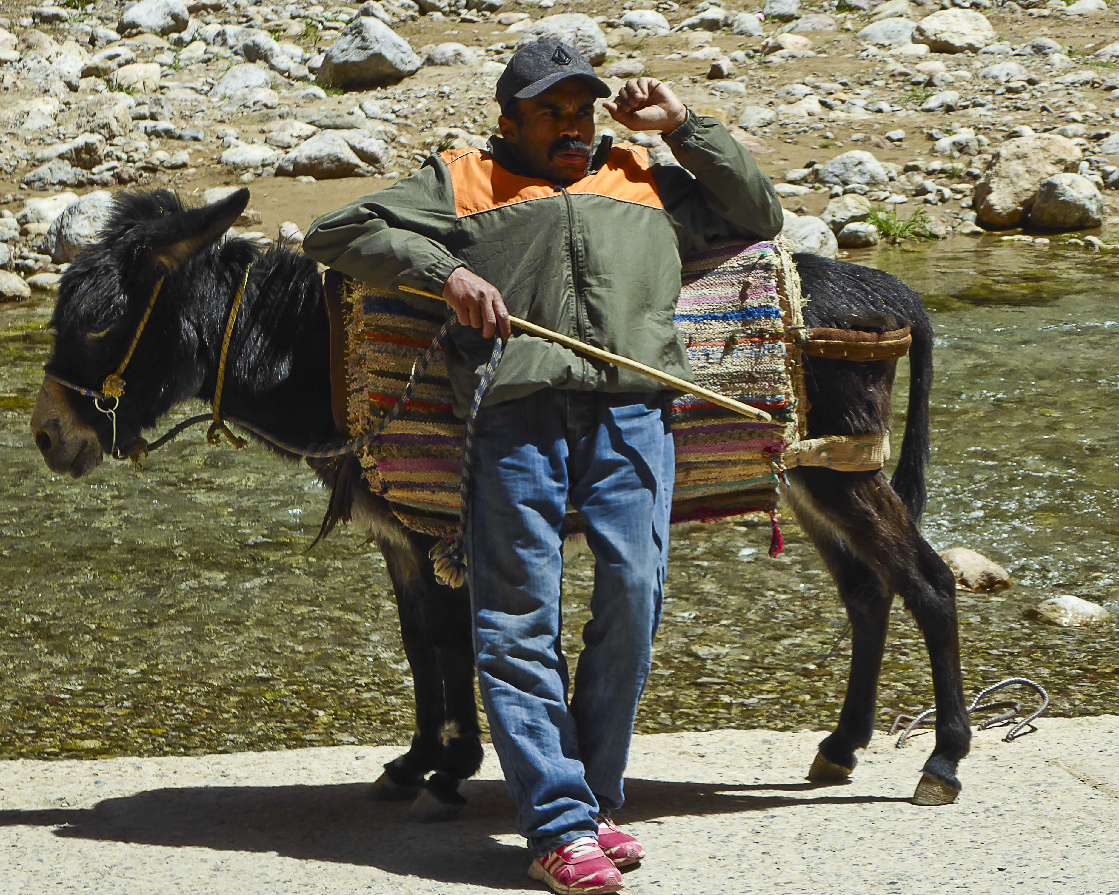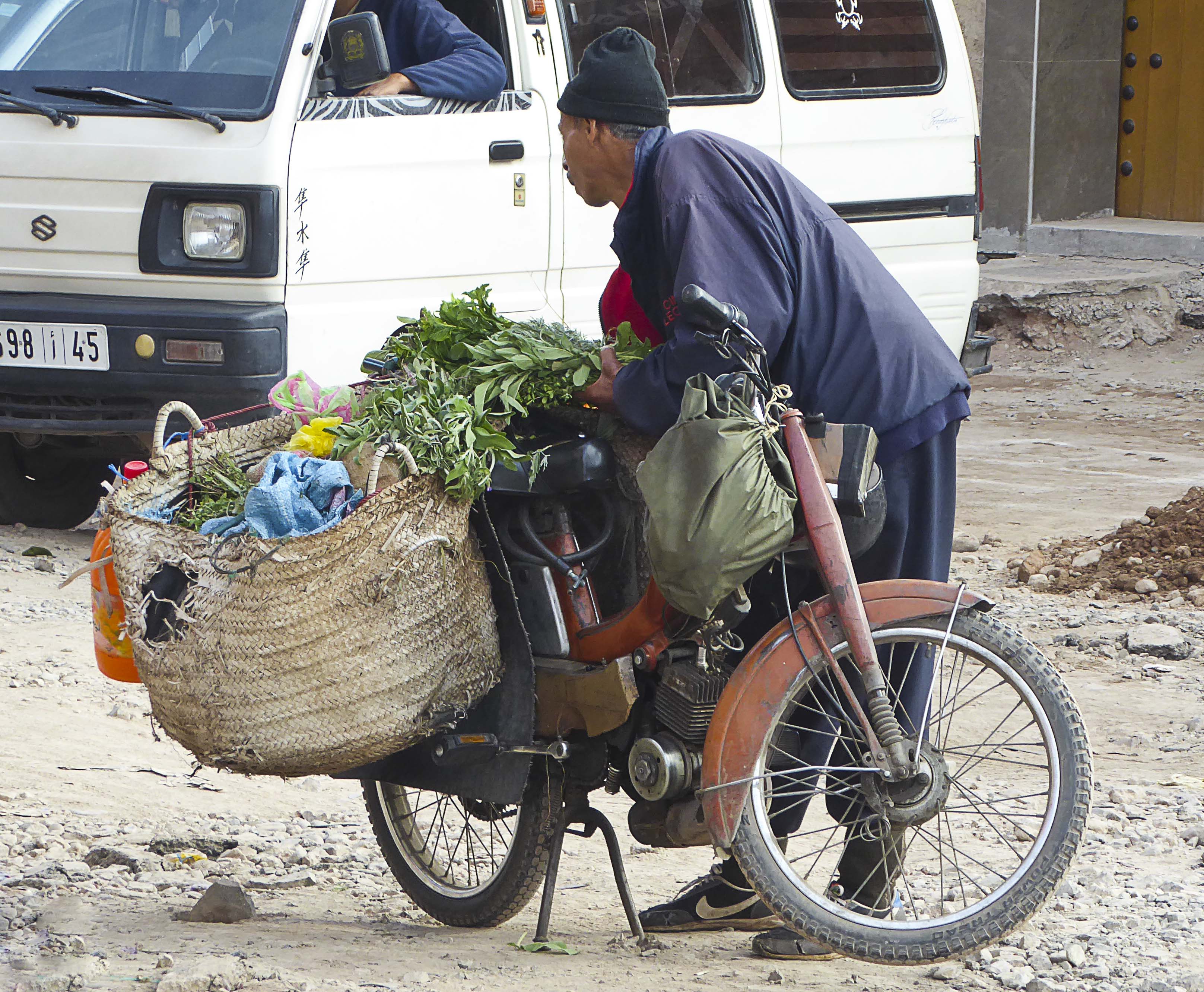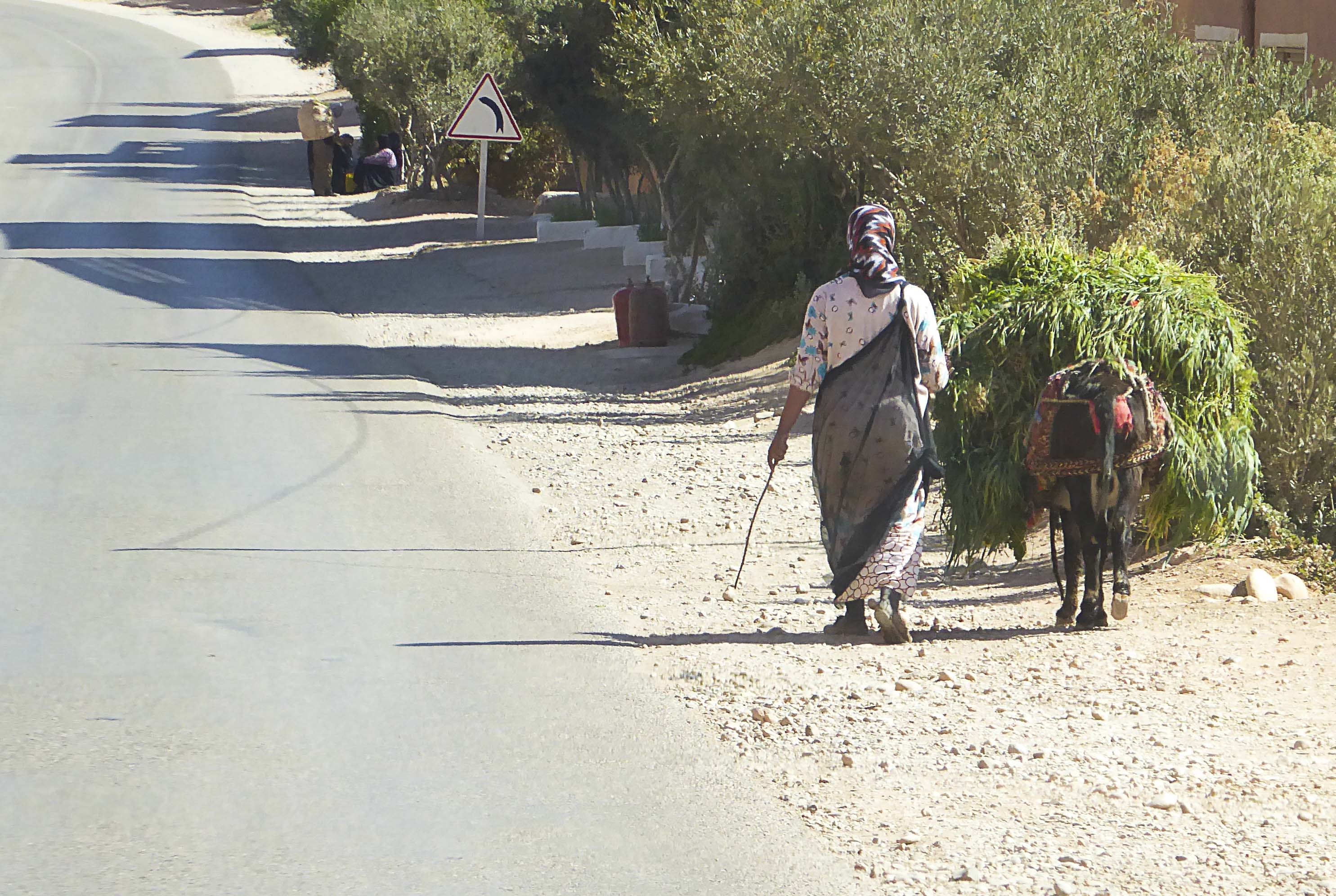 When you have passed the High Atlas mountain range, there are endless, dusty, desert roads. But no matter how long or dusty the road, there are still people going about their daily chores – along the very same road.