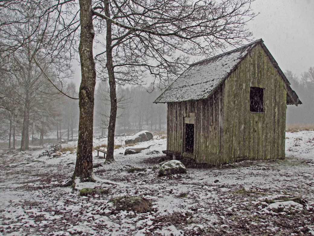 An early spring day some years ago, it started snowing on my way back home from the forest walk. This deer shed was still standing. (Now gone) The photo became a favorite with both my readers and me.