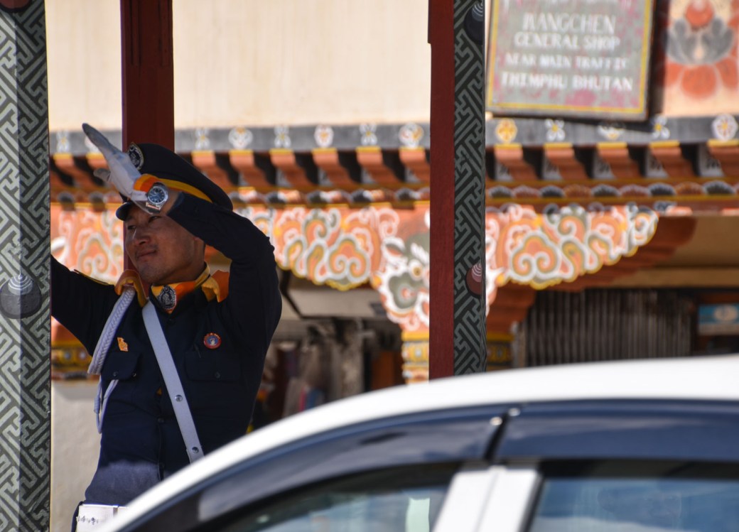 There are 80 000 citizens in Thimpu – and they love their traffic light! Take a look at these two clips. In the second one, notice the traffic sign for pedestrians behind him – the person on it is wearing a Gho. (The male national dress)
