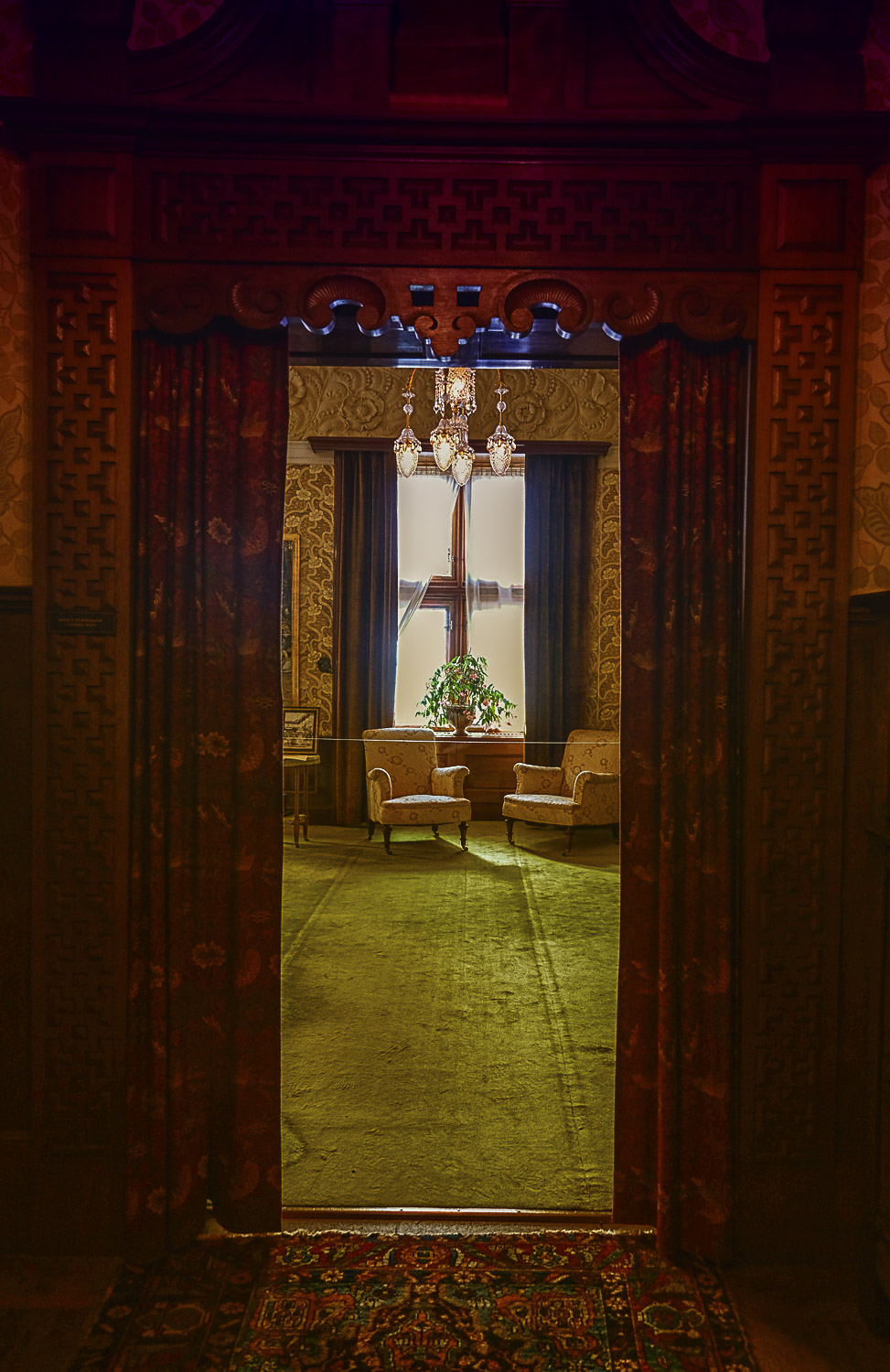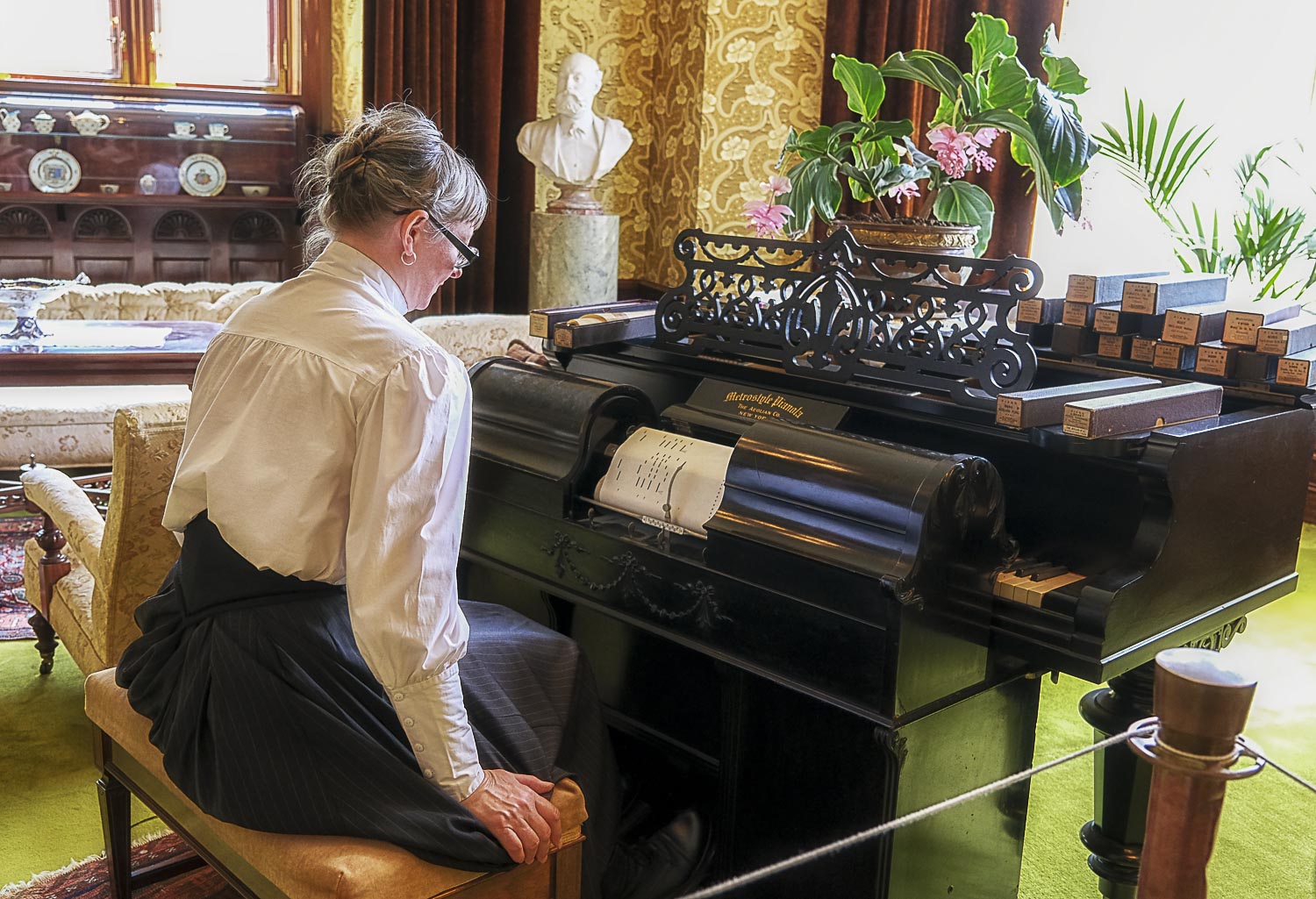 I especially want you to look at the green carpet room. The entrance to the room was meant to lead the eye along the (very) green broadloom (?) and through the window, out in the green of the garden. To create a feeling of wholeness – indoors and outdoors nature. The player piano or pianola in the last picture, is one of the last existing, working pianolas. The many boxes on top of it contains pieces of music for the instrument. The lady, one of the guides, offered to play the pianola for us. It worked perfectly well!