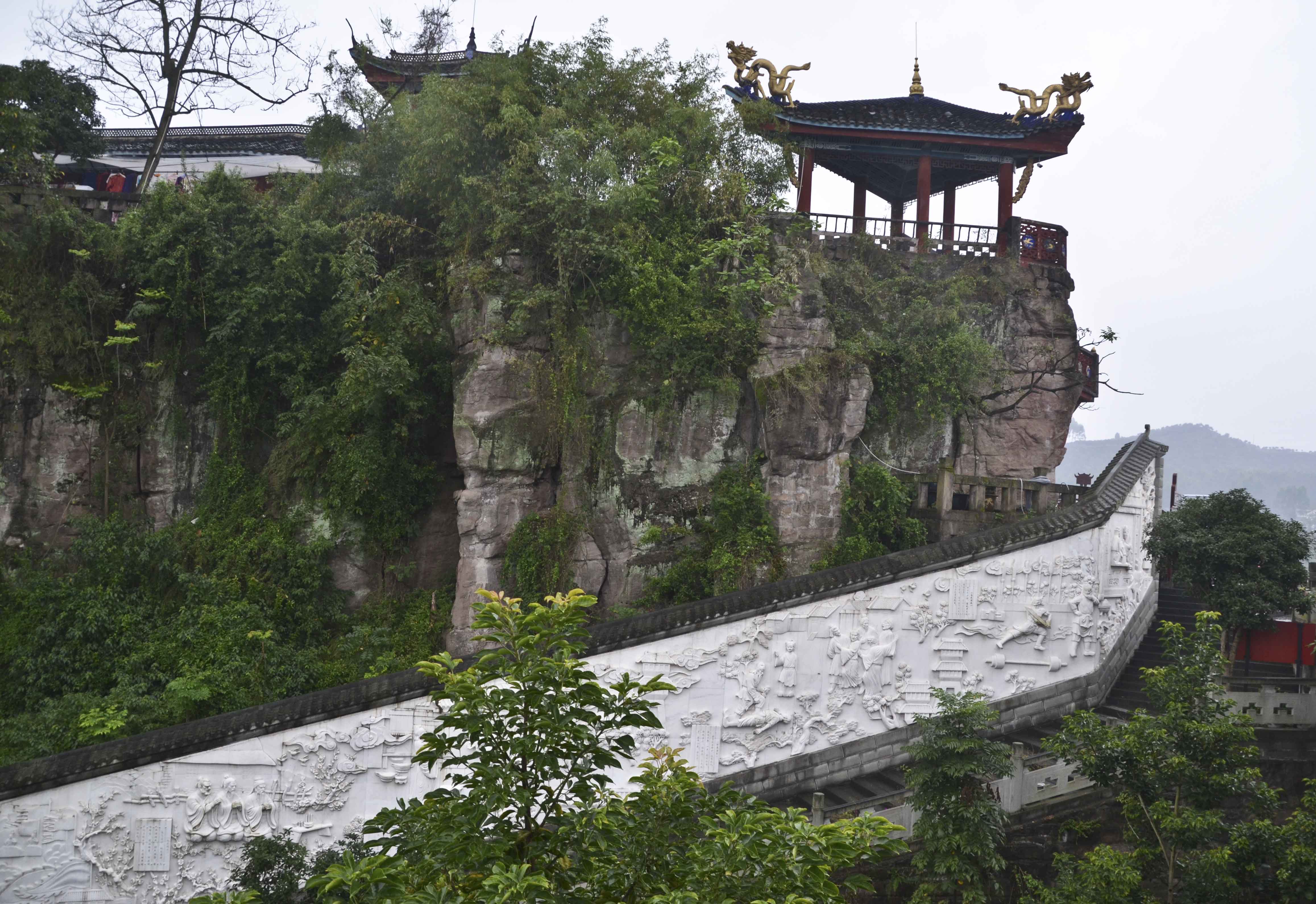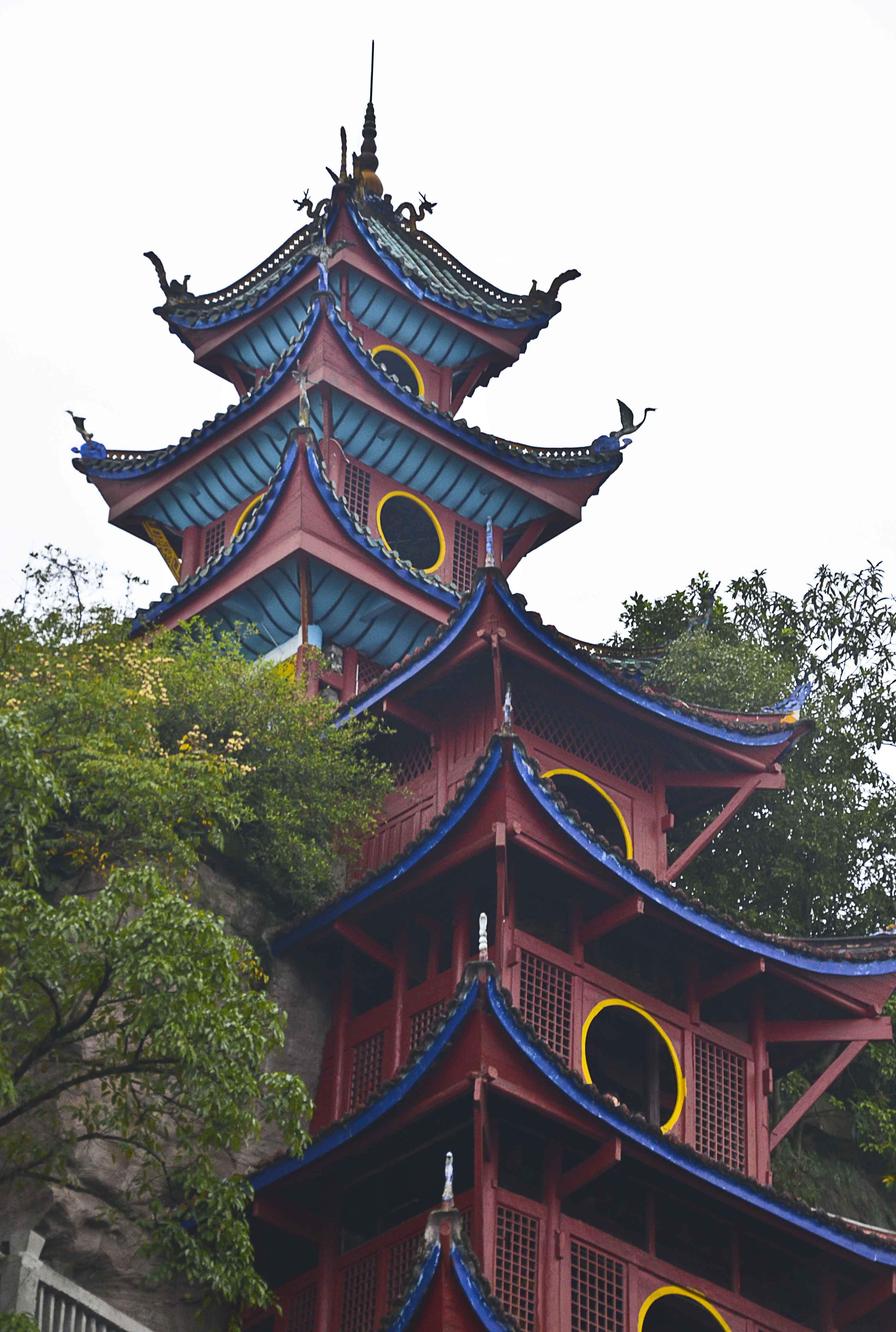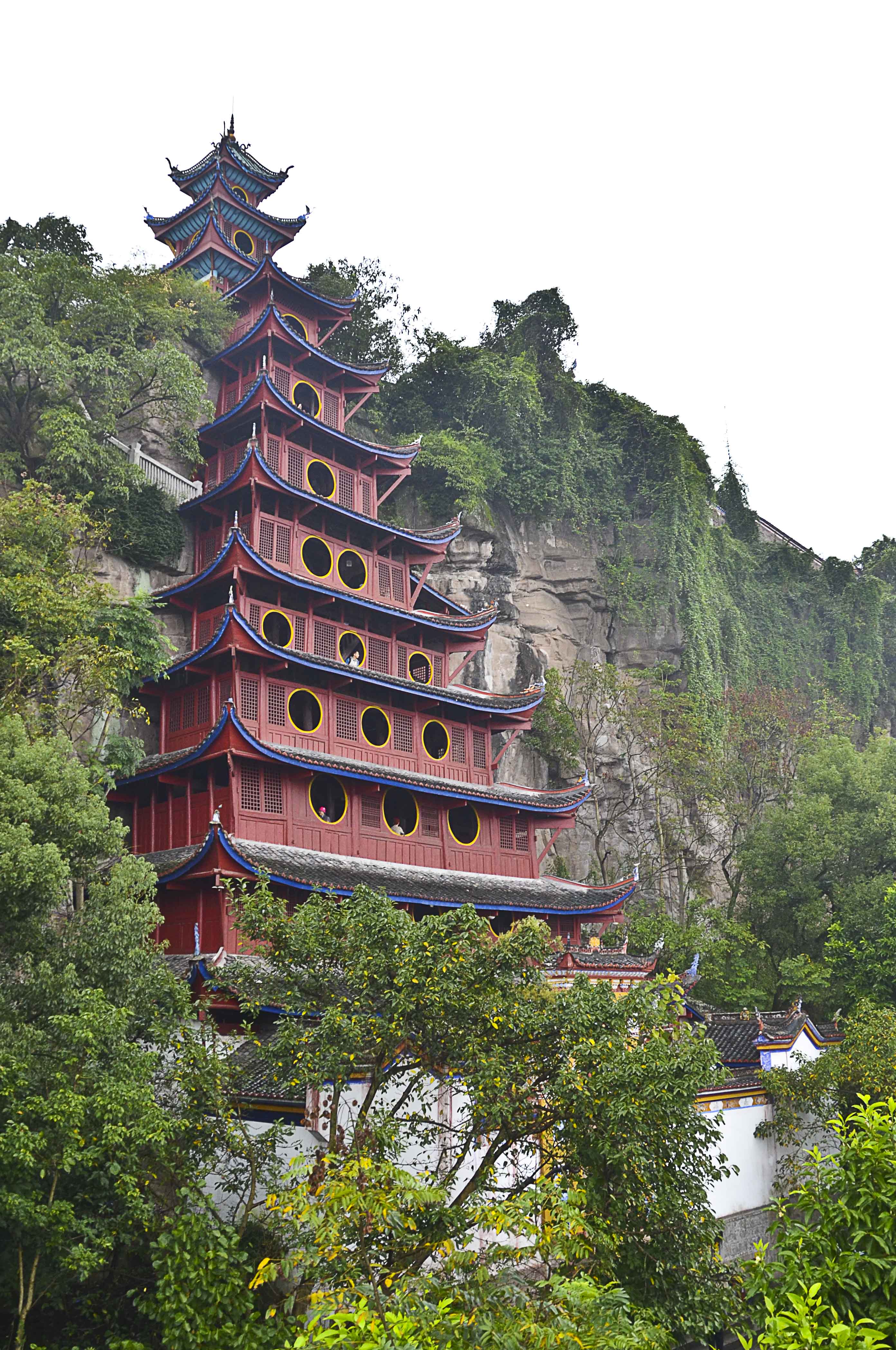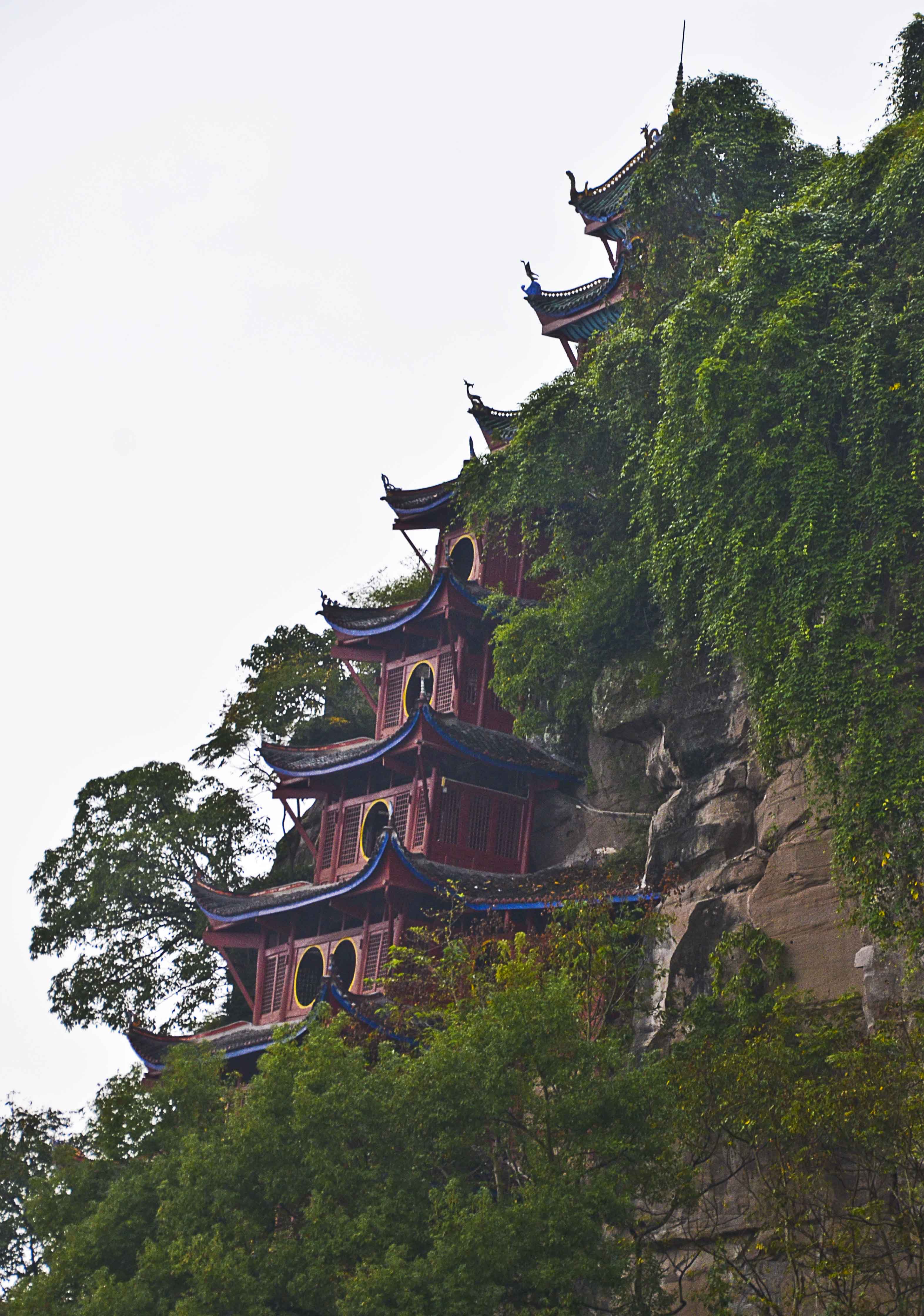In the Territory of Zhongxian County of Chongqing there is a rock on the Yangtze river, with a vermilion 12-storey pavilion built against it.